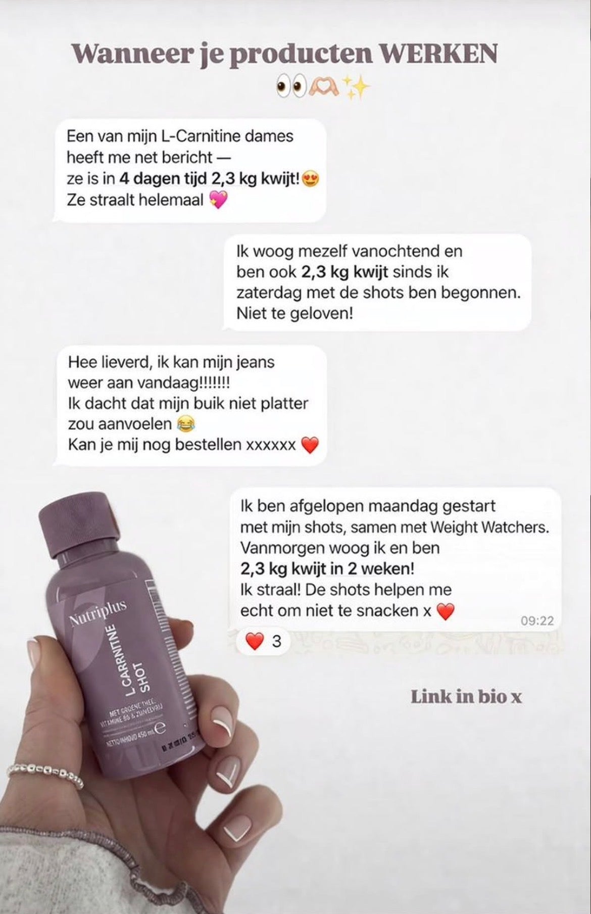 Elke portie (30 ml) bevat: 1500 mg L-carnitine, 50 mg groene thee-extract, 1,17 mg vitamine B6, 2 g eiwit.
